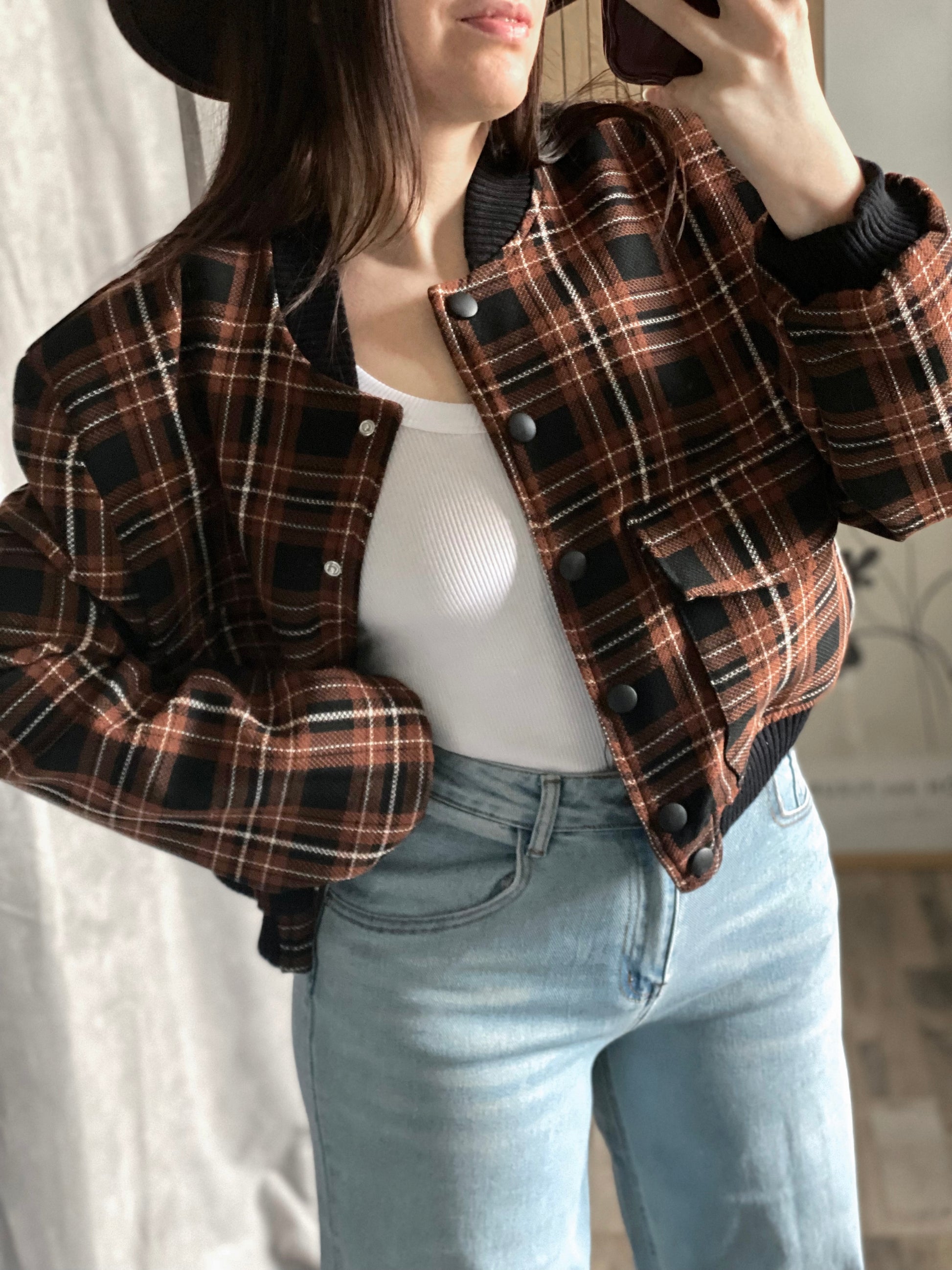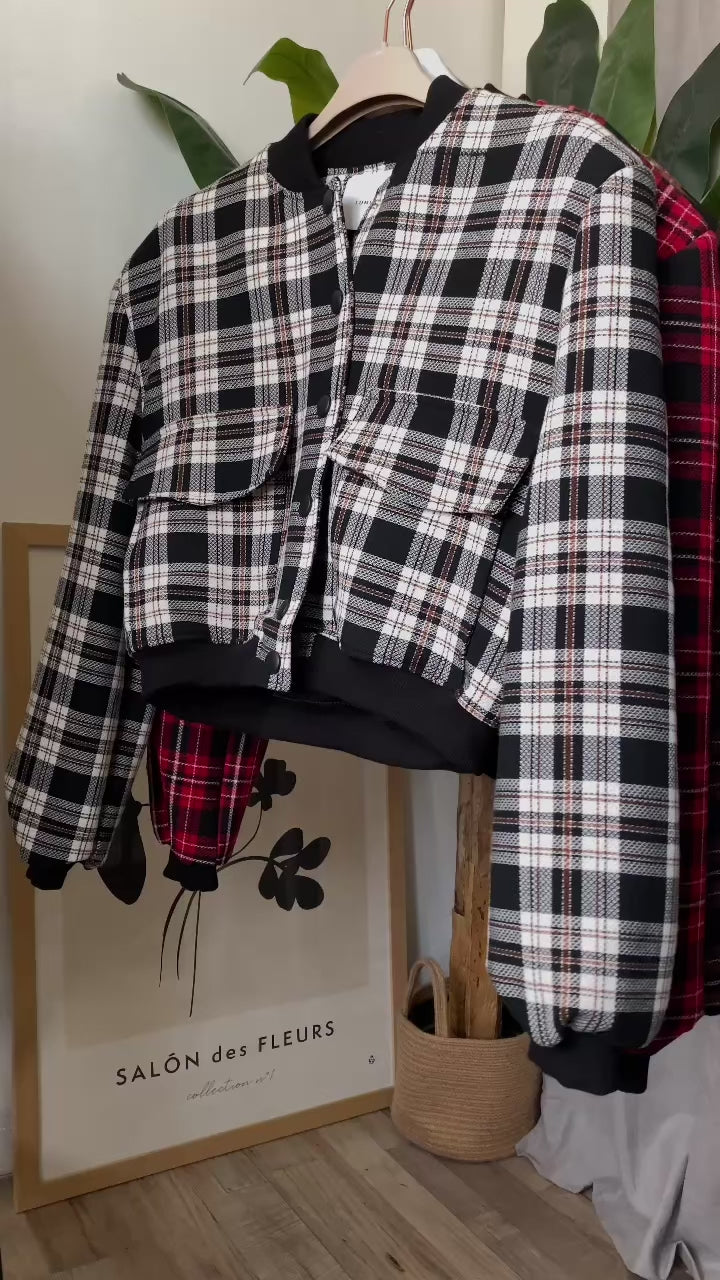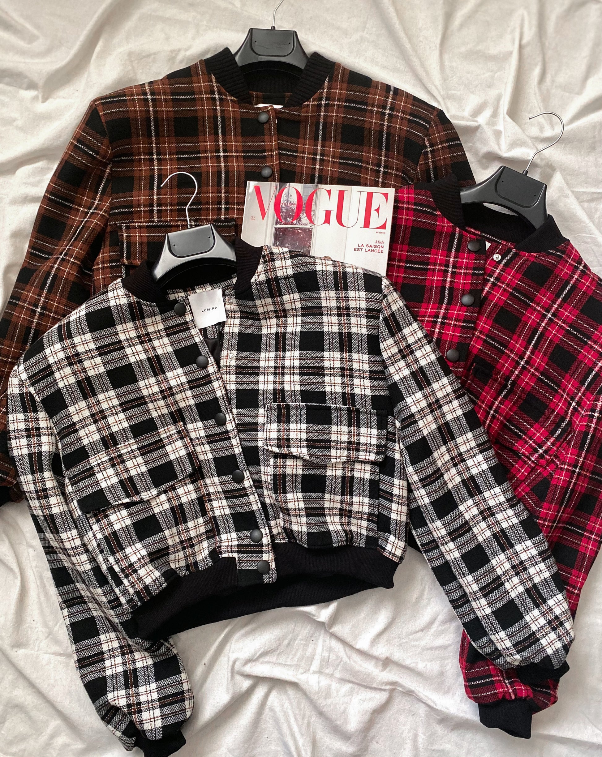 • Bomber tartan Lumina, chiusura bottoni a pressione, due tasche laterali, spalle imbottite