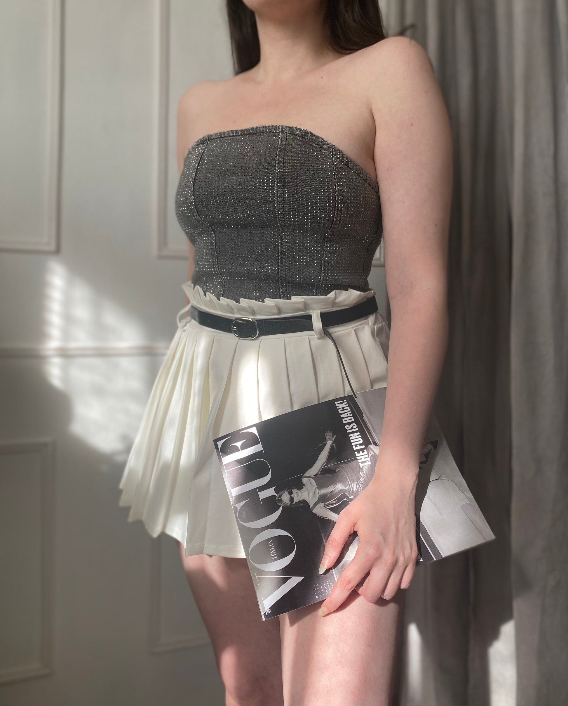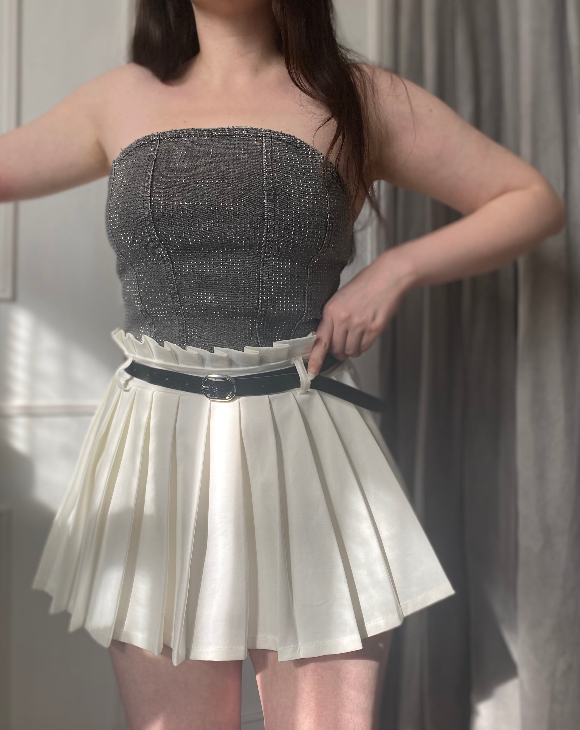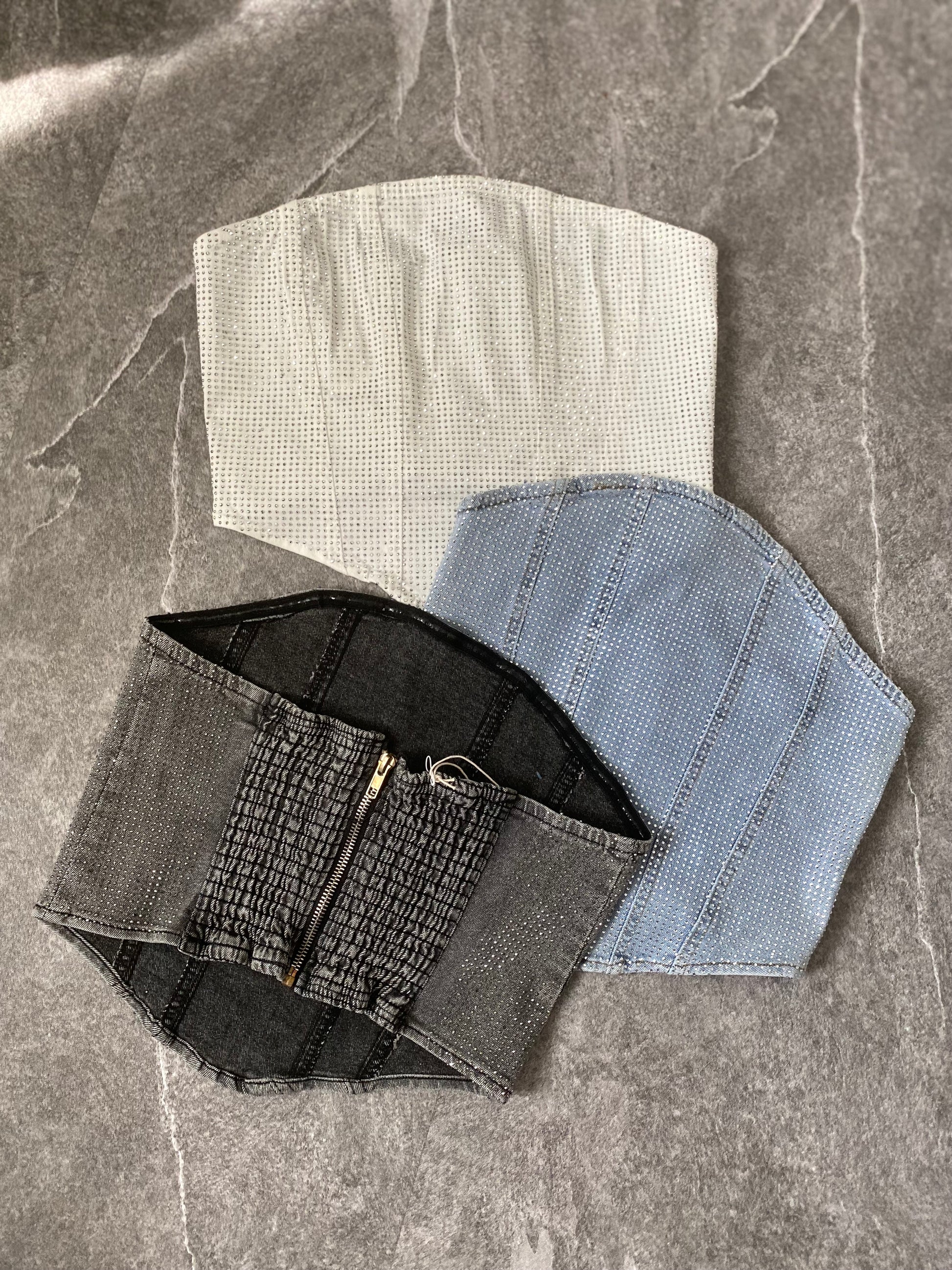 • Bustino senza spalline, strass applicati, elastico e zip sul retro