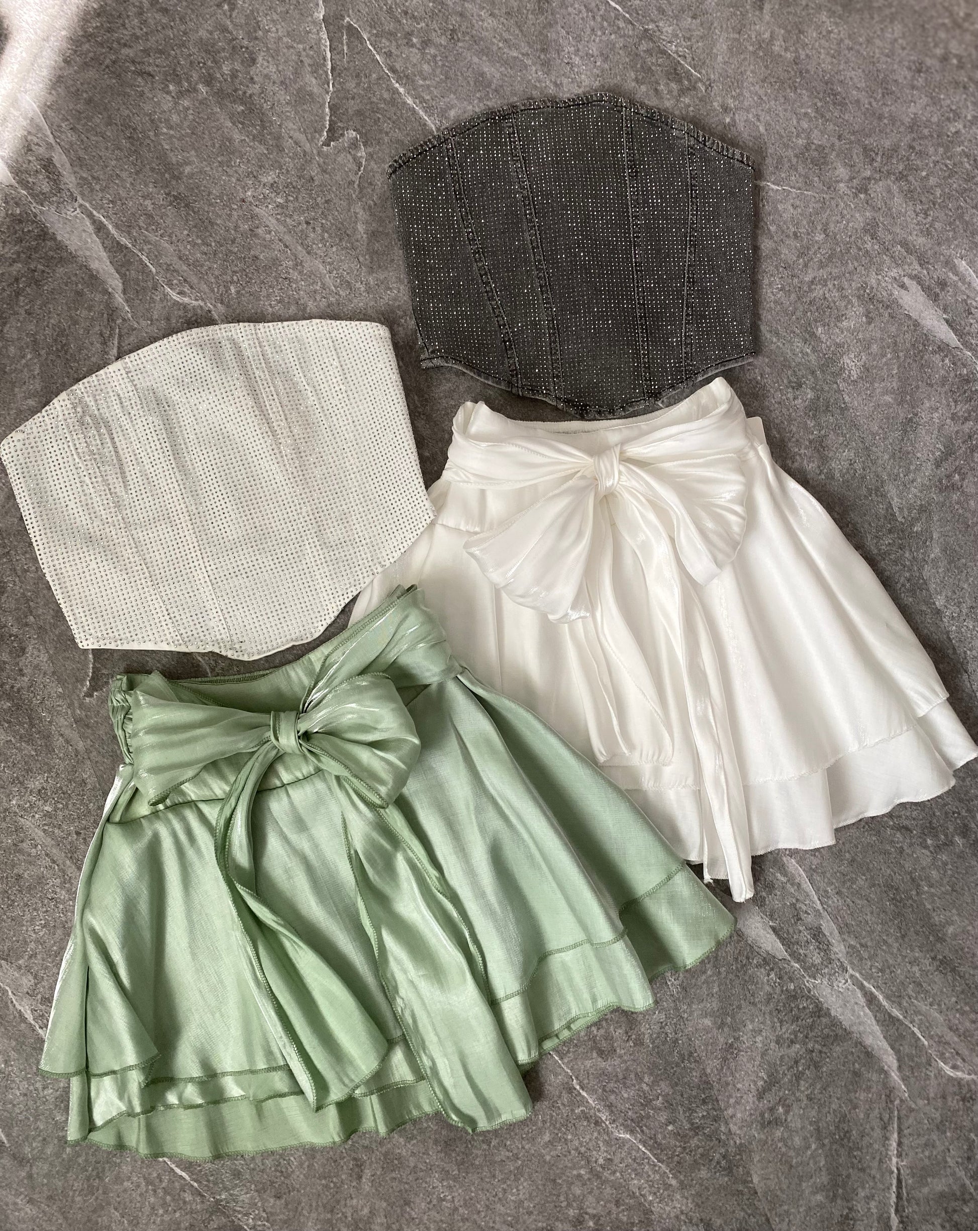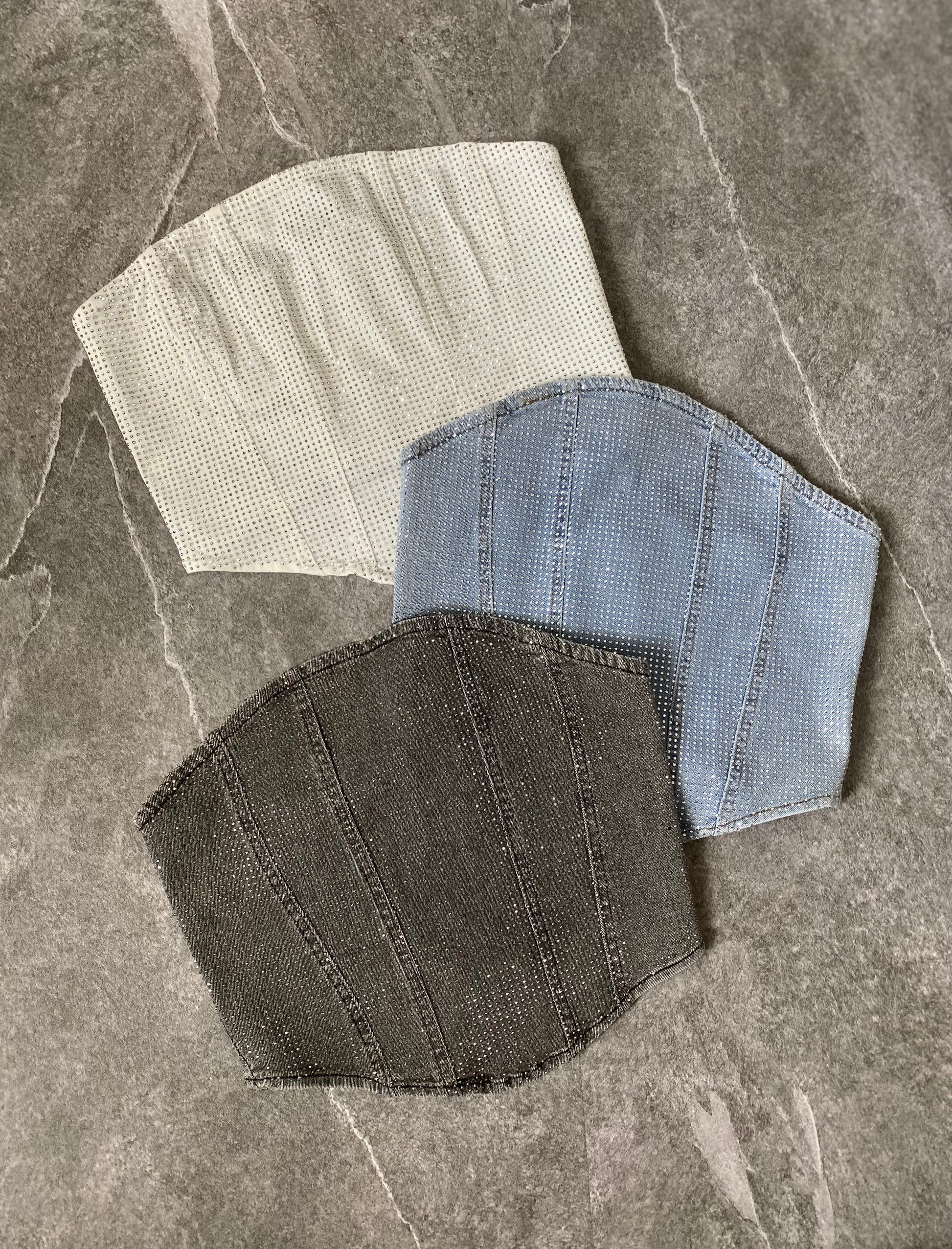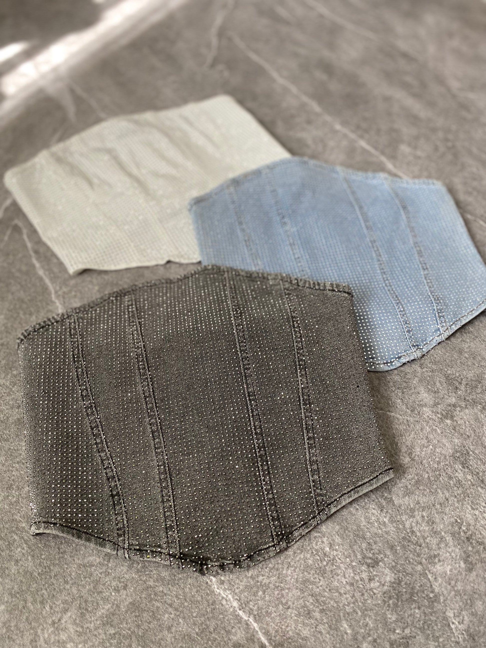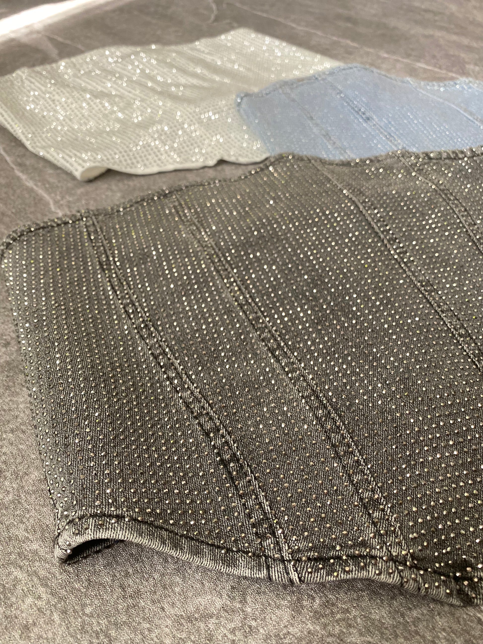 • Bustino senza spalline, strass applicati, elastico e zip sul retro