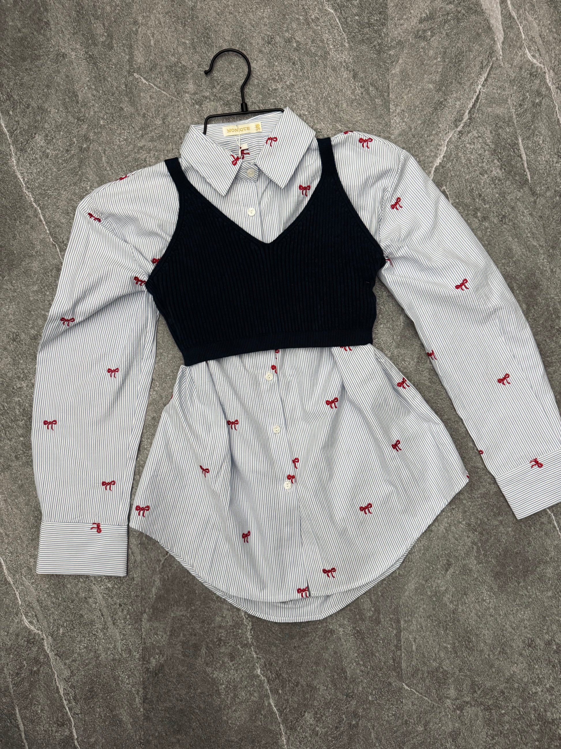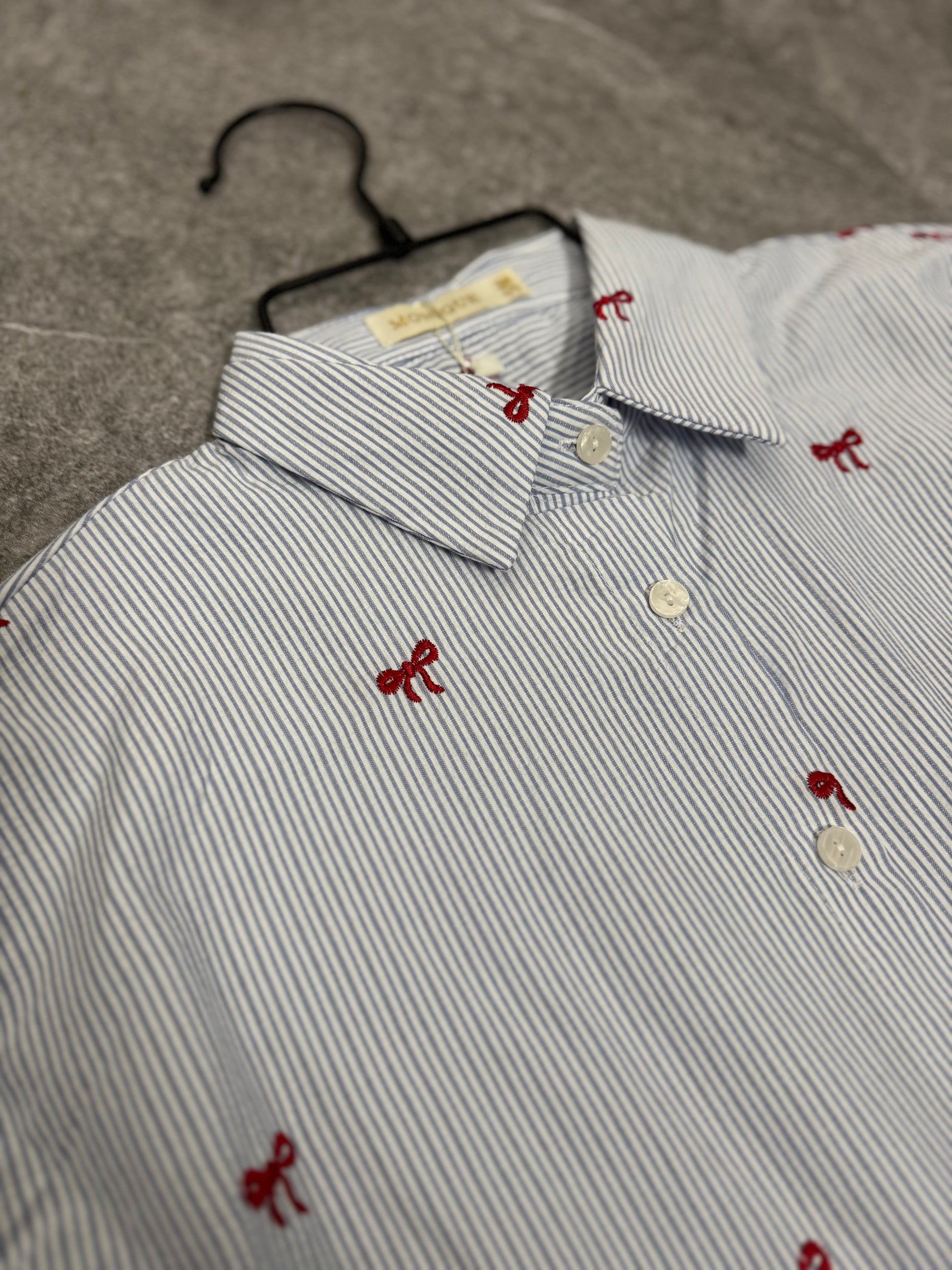 • Camicia modello classico a righe azzurre, fiocchetti burgundy ricamanti. Top non incluso, acquistabile a parte