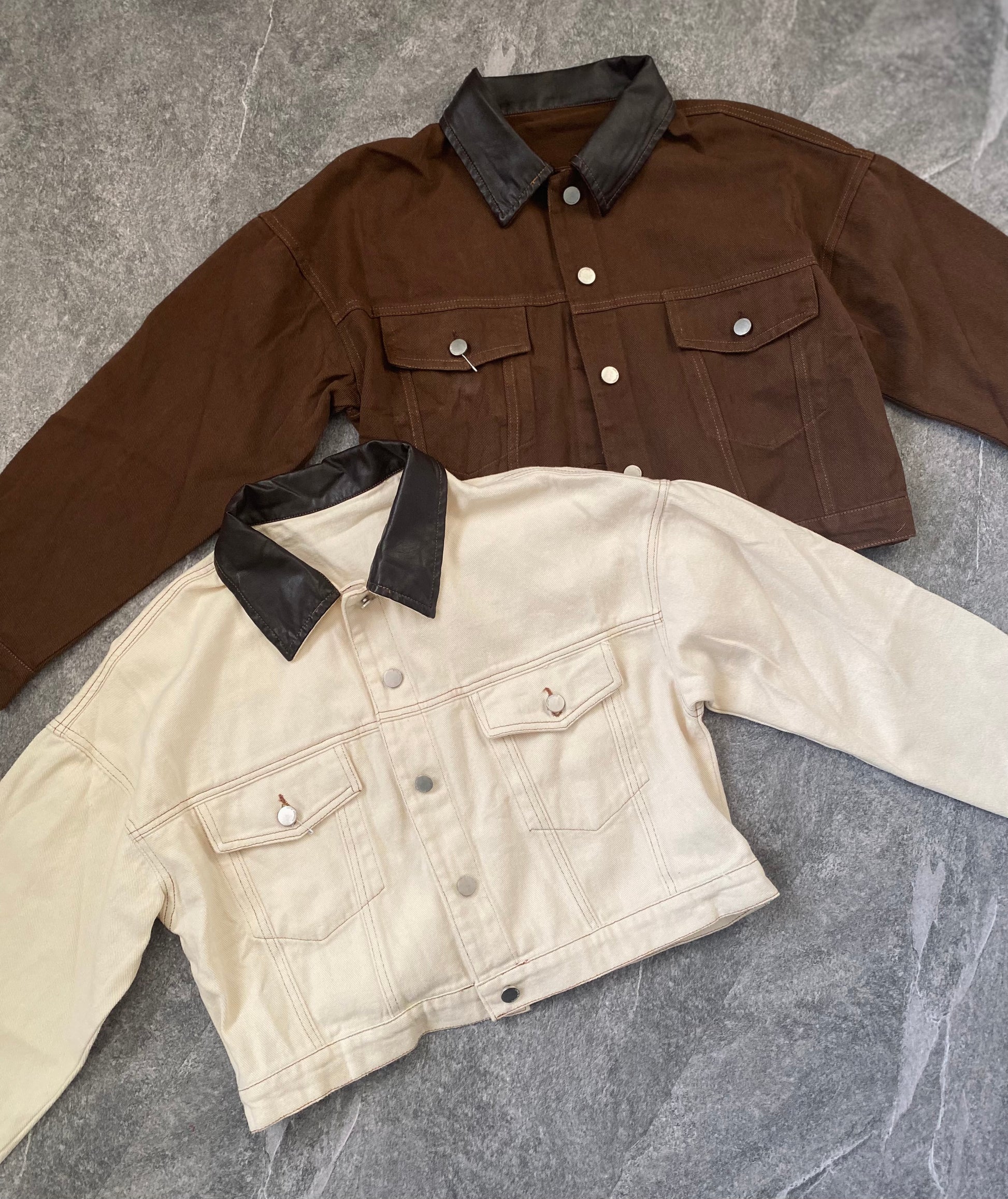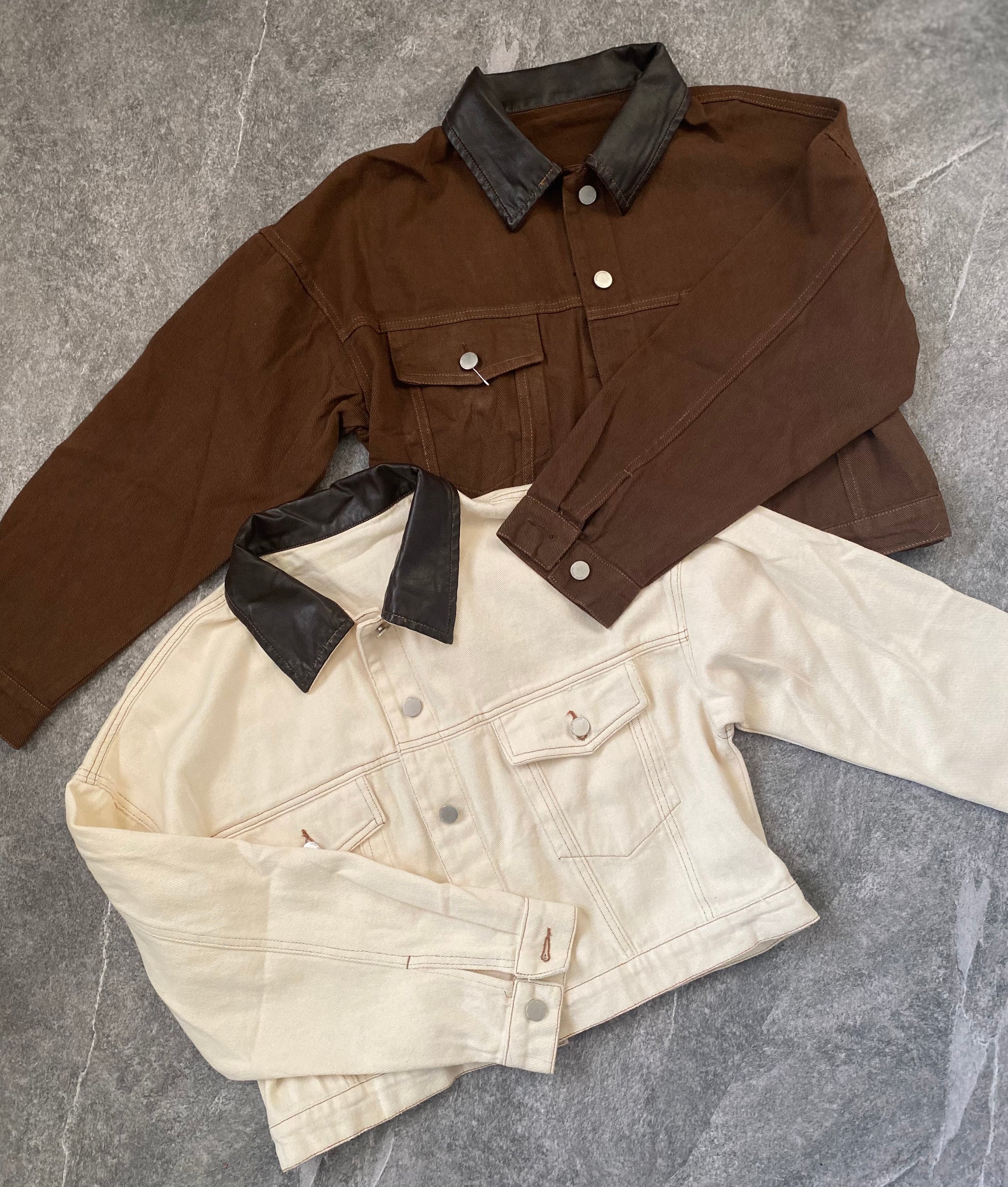 • Giacca leggera simil denim con colletto finta pelle, modello over, tasconi sul davanti, bottoni metallici, non foderata