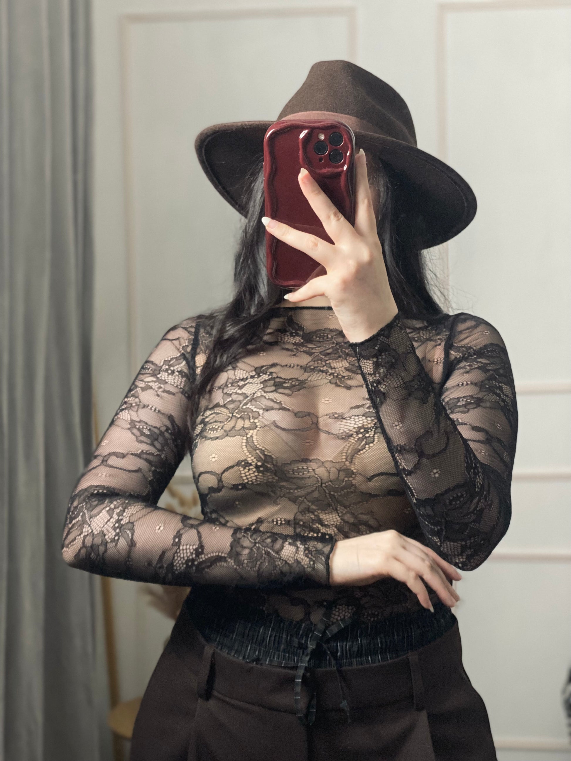 • Maglia in pizzo totalmente trasparente, maniche lunghe