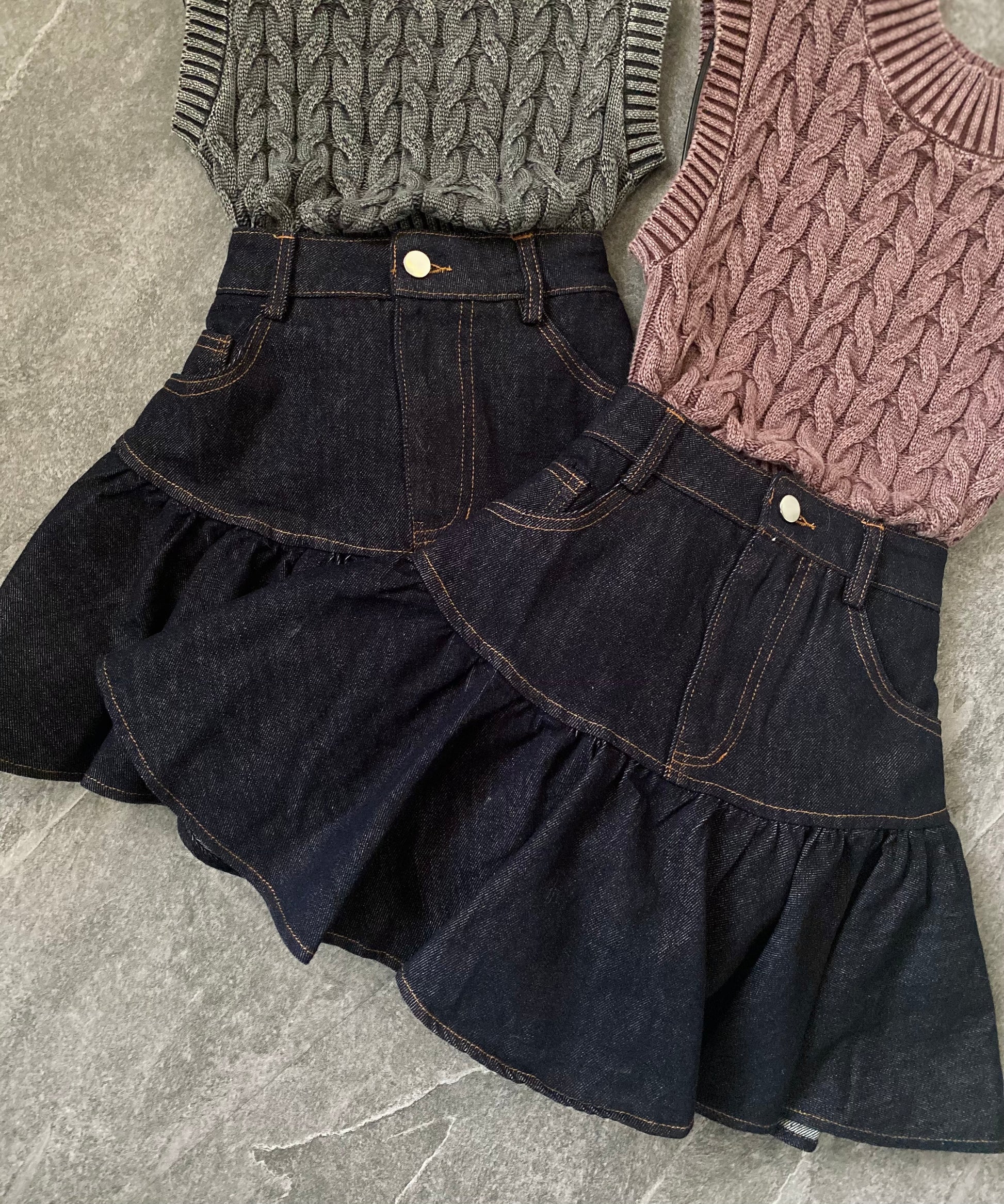 • Gonna denim lavaggio scuro, fondo campana, cuciture beige, 5 tasche, pantaloncino sotto, chiusura zip e bottone